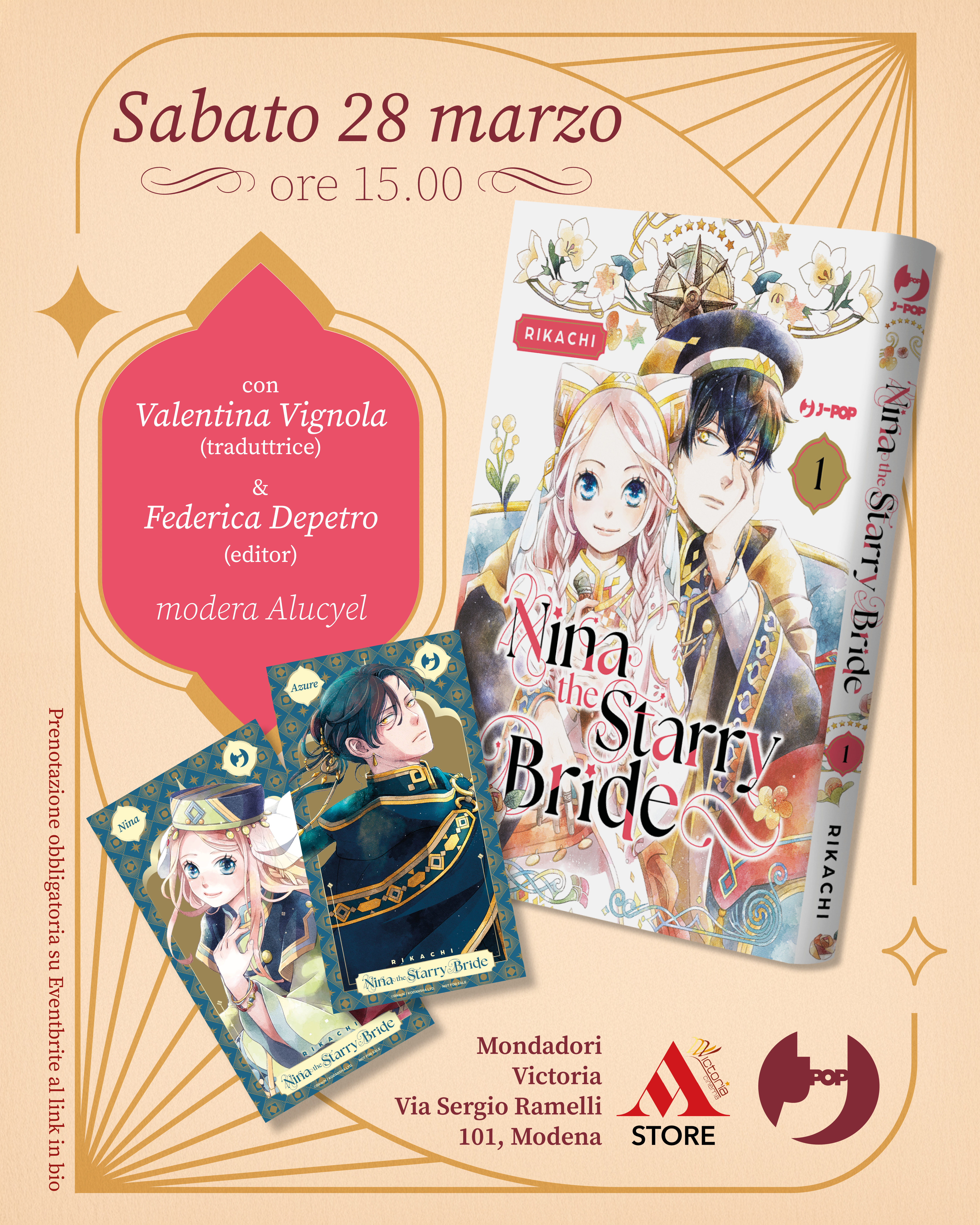Questa attesissima novità sarà presentata in anteprima sabato 28 marzo alle ore 15:00 presso la Mondadori Victoria di Modena in compagnia della traduttrice Valentina Vignola e dell'editor Federica Depetro. L’ingresso è libero fino a esaurimento posti e i partecipanti riceveranno in omaggio due gadget esclusivi ispirati alla serie: le illustration card di Nina e del principe Azure.